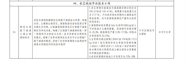 近日,水利部全国节约用水办公室公示了《国家成熟适用节水技术推广目录(2023年)》(下称《目录》),全国入选34项,其中农田节水灌溉技术9项,灌区水管理技术5项,智慧灌溉技术9项,农艺栽培节水技术6项,畜牧渔业节水技术1项,农村生活节水技术4项。经单位推荐、专家评审等环节,云顶国际娱乐 王振华教授团队成果“棉花长期膜下滴灌土壤生境调控技术”成功入选《目录》。据悉,2019—2023年水利部共公布4批(除2022年)《目录》,合计194项成果,这是新疆单位成果首次入选该《目录》。