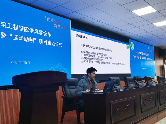 娄哲代表学院党委对“蓝泽助翔”朋辈帮扶计划项目的顺利实施表示祝贺。他强调,11月是我校的学风建设月,也是学院2023年学风建设年的关键阶段,“蓝泽助翔”朋辈帮扶计划的正式启动,是加强学院“三全育人”体系建设和学风建设的有益补充,对于培养学生自主拓展学习和身心发展都有着积极作用。希望项目团队成员广泛深入开展调查研究,在负责教师的教育指导和监督下扎扎实实开展工作,切实发挥好朋辈育人互相支持和共同成长进步作用,取得预期成效。