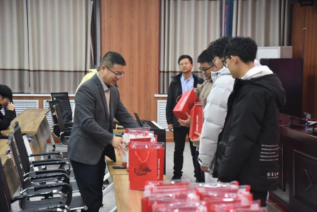 娄哲代表学院党委向同学们表达慰问,为考研学子们加油打气,鼓励同学们在考研的最后冲刺阶段要调整好心态,以饱满的精神状态迎接考试。随后,娄哲为考研学子们发放了考研温馨大礼包,情意满满的大礼包“内容”非常丰富,有柿子、橙子和订制版可口可乐,寓意“事事如意、心想事成、成功上岸”;有考试专用工具、口罩,为考试顺利保驾护航;还有辅导员、班主任手写祝福卡片,让同学们被爱包容充满力量。