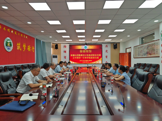 7月31日,新疆兵团勘测设计院集团股份有限公司党委副书记、总经理宋剑鹏,副总经理蔡宝柱,总承包公司党委书记张文刚,总承包公司总经理宋贤贺,一分院党委书记高宗昌,一分院院长李学红等一行来云顶国际娱乐 座谈交流。石河子大学党委常委、副校长叶含春,学院党委副书记、院长王振华,副院长陈伏龙,学院党委委员、水利水电工程系主任金瑾教授(挂职八师水利局副局长)等参加座谈。