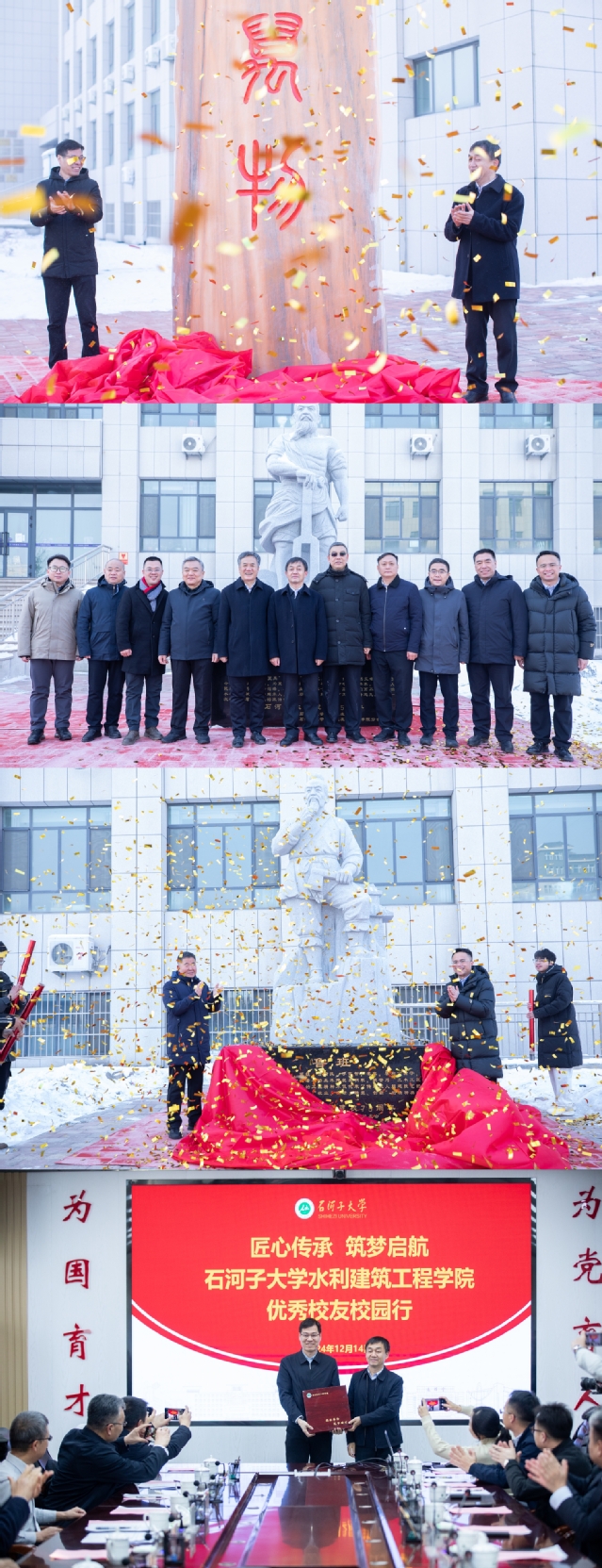 捐赠仪式上,校党委常委、副校长叶含春,云顶国际 党委书记王振华,副院长袁康与捐赠校友代表周宝华、王长随、陈斌民分别为“水利石”、“大禹像”、“鲁班像”揭幕,并回赠了专属订制纪念品。王振华代表学院向校友们汇报了学院发展情况和远景规划,在校学生代表献上了原创作品《石雕礼赞》诗朗诵。