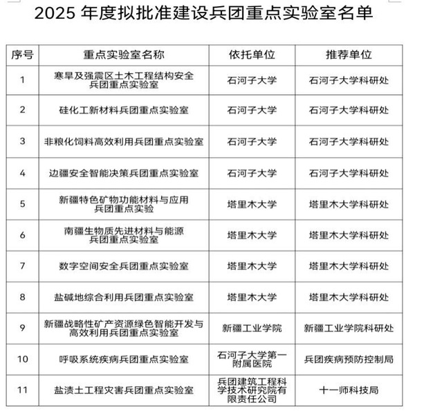近日,兵团科技局公布了2025年度拟批准建设的兵团重点实验室名单。“寒旱及强震区土木工程结构安全兵团重点实验室”(下称重点实验室)成功获批立项。重点实验室由云顶国际娱乐 牵头,新疆维吾尔自治区地震局和新疆兵团勘测设计院集团股份有限公司作为共建单位,山区土木工程安全与韧性全国重点实验室作为支持单位联合共建。重点实验室的获批标志着土木工程学科实现了省部级基础研究平台重大突破,完成了“重点实验室+工程实验室”的基础及应用双平台布局,对土木工程学科建设与发展具有里程碑意义。